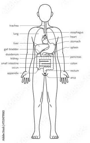 Male human anatomy vector diagram. Male body internal organs chart with labels on white background.