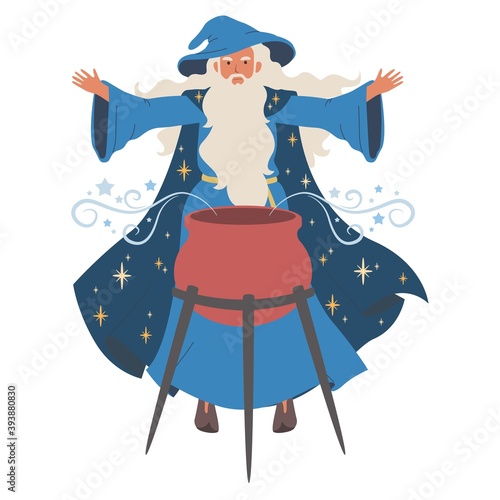 Male wizard conjures over cauldron with potion vector icon isolated on white background.