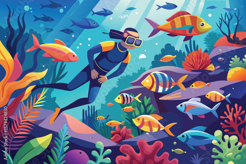 Man and woman couple wearing aqualung and suit enjoying romantic scuba diving swimming together underwater watching sea ocean inhabitant and coral reef vector illustration