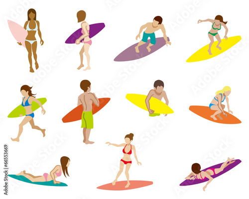 Man and woman in swimwear surfer isolated set. Bundle of happy young athletic people with surfboards enjoying extreme sports water activities vector illustration