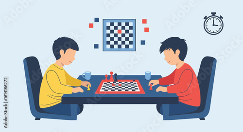 Young man and woman playing chess board game on smartphone screen, flat vector isometric illustration. Online chess tournament. Mobile gaming.