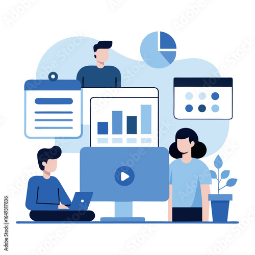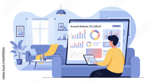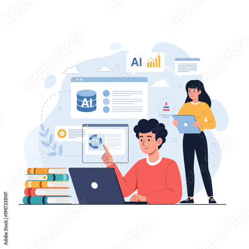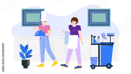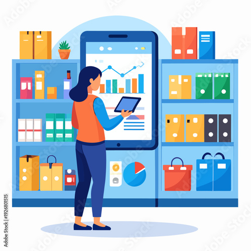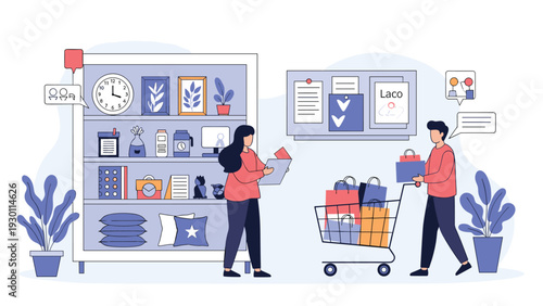 Man buying new cell phone. Seller showing smartphone to customer, flat vector illustration. Phone store interior.