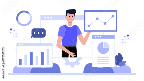 Man choosing video channel on laptop computer to start watching, flat vector isometric illustration. Podcasting, multimedia content concept.