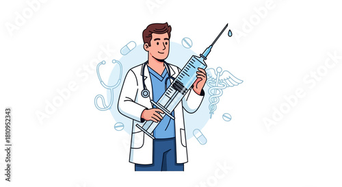 Man doctor holding syringe with vaccine vector icon isolated on white background