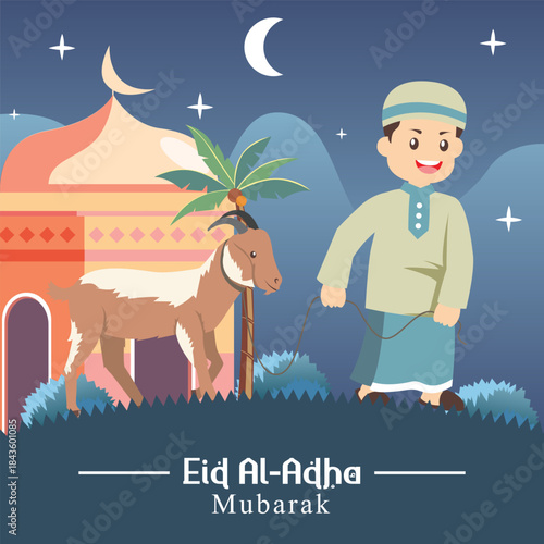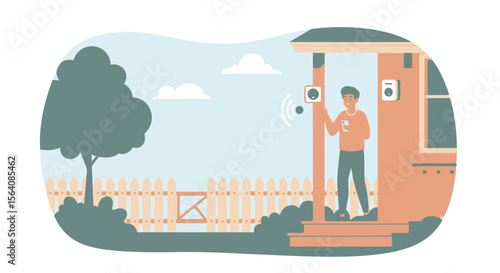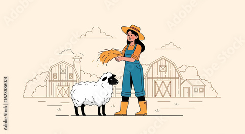Man farmer taking care of cow at stall vector illustration. Male farm worker standing with pitchfork at livestock isolated on white background. Agriculture and village farmland concept