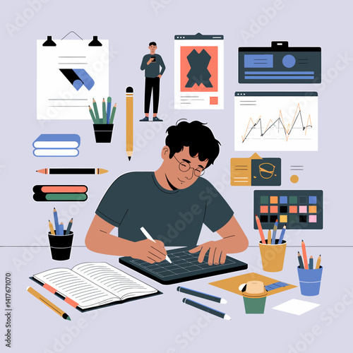 Graphic illustrator working at computer vector. Busy man creative worker illustration. Freelancer at home workspace using software for game asset creation. Graphic design and development