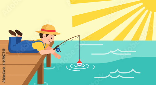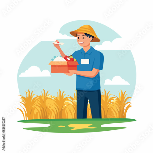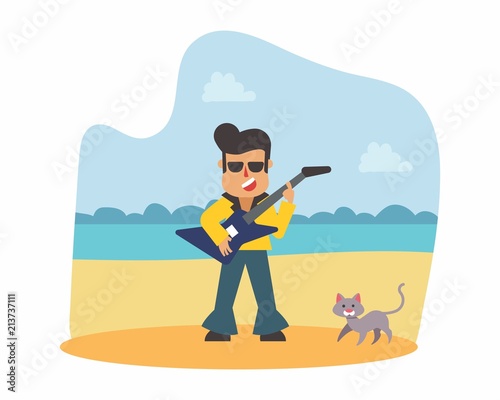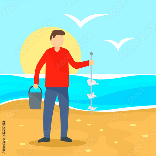 Bearded man holding big fish. Vector illustration in flat style. Fishing hobby concept design element.