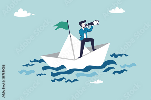 Businessman in sinking paper boat unable to repay outstanding debts vector illustration. Business bankruptcy, financial crisis concept