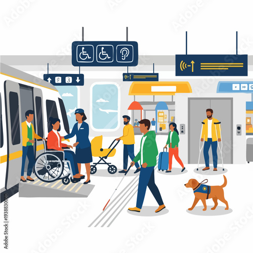 Barrier free environment vector. Man in wheelchair rides on ramp to bus illustration. Equal opportunities and common space for people with different physical abilities