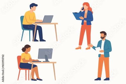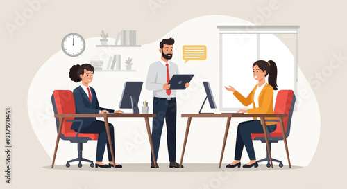 Man job sicker having online interview with female hr manager via computer vector illustration. Hiring employee and recruitment agency concept