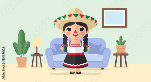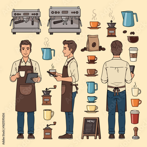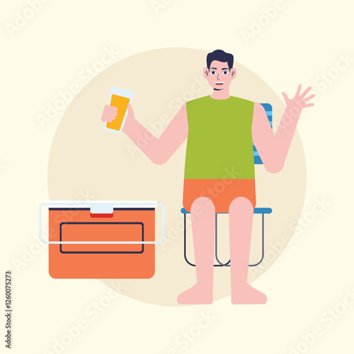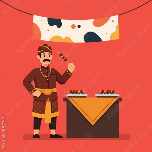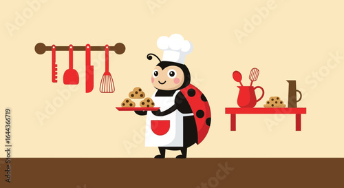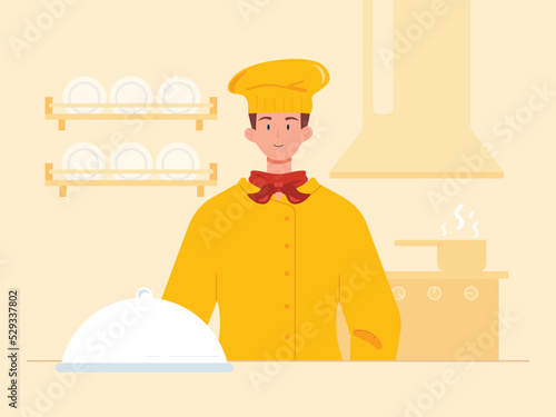 Bearded man holding three layer cake with cherries in kitchen. Vector illustration in flat style. Cake making and decorating hobby concept design element.