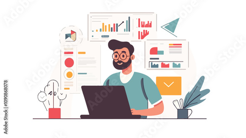 Young man doing shopping online using laptop computer, flat vector illustration. Male character making purchases online. Internet store, e-commerce.