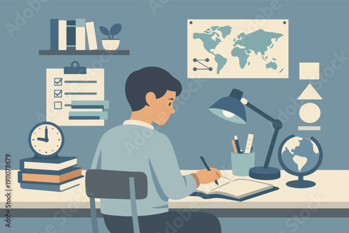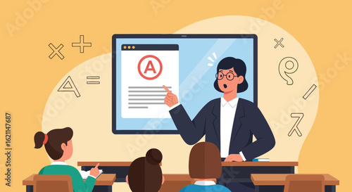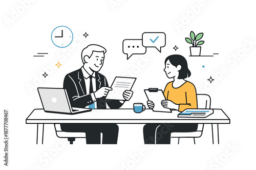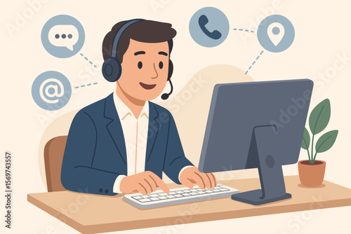 Man remotly working with different people using online communication. Vitrual business team concept vector illustration. Video call, telecommuting, vitrual communication, online work.