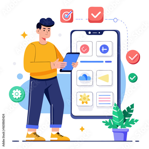 Man using self-service cinema kiosk to buy tickets vector illustration isolated on white background