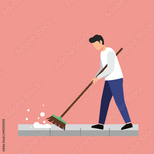 Man vacuuming floor in his room. Cleaning service concept vector illustration. Guy cleaning home living room.