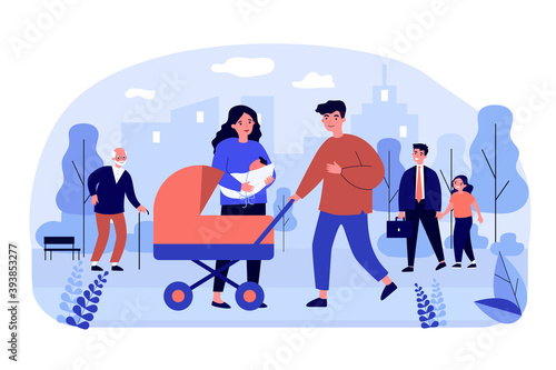 Man walks on a street with fresh air helmet. People wearing mask to protect covid coronavirus. Air pollution concept vector illustration. Respiratory system.