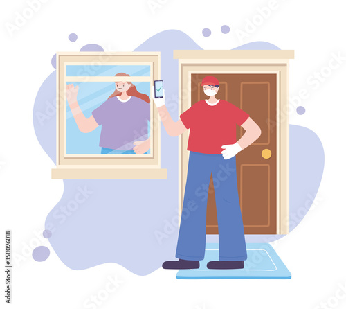 Man washing window in living room, flat vector illustration. Housework, household chores, housekeeping, house cleaning.