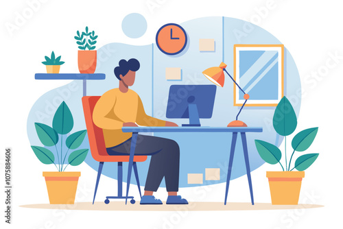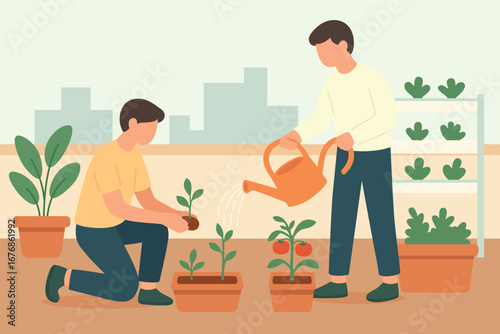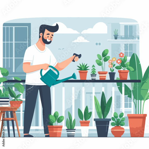Man watering houseplants with watering can, flat vector illustration. Housework, household chores, housekeeping, hobby.