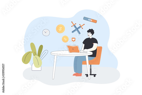 Man with mobile phone at coffee shop vector icon. Male character surfing internet sitting at table isolated on white background
