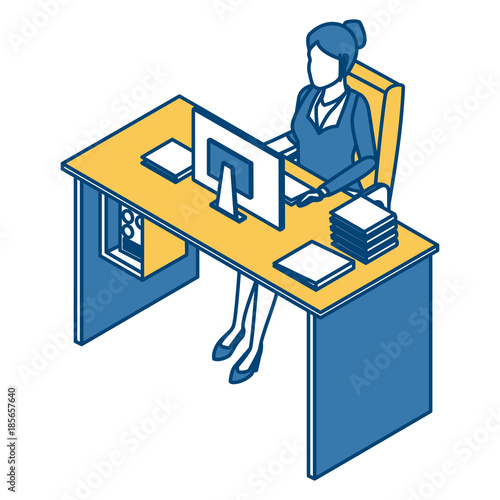 Man working at computer vector. Remote work icon. Designer freelancer, businessman at workplace isolated on white background