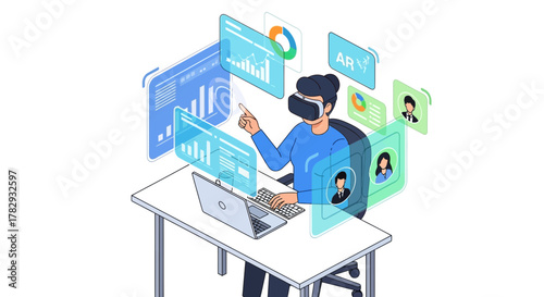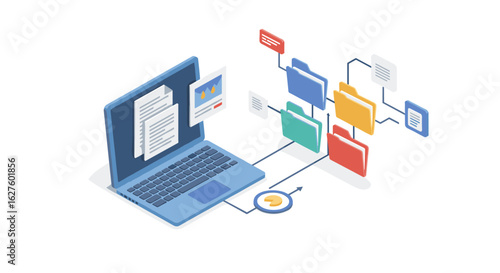 Businessman working on laptop using cloud system, flat vector isometric illustration. Data storage, cloud computing technology.