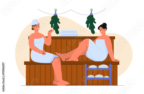 Married couple steaming in sauna with oak brooms vector icon isolated on white background.