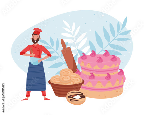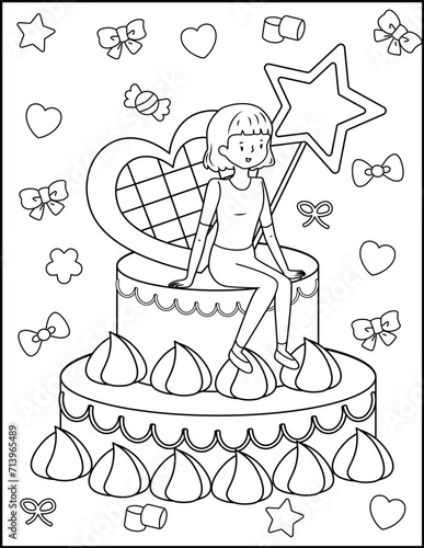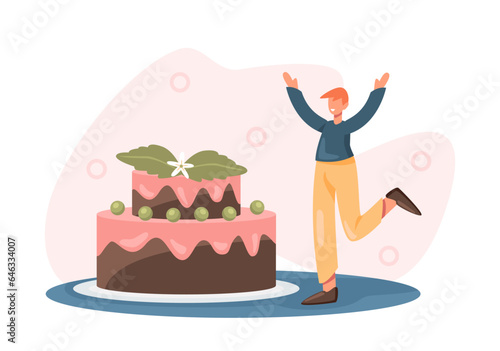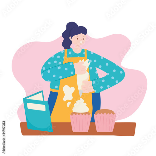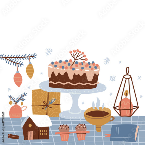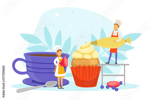 Marshmallow drink and cupcake with small pumpkin on a top. Autumn season hot drink concept vector illustration. Marshmallow sweet.