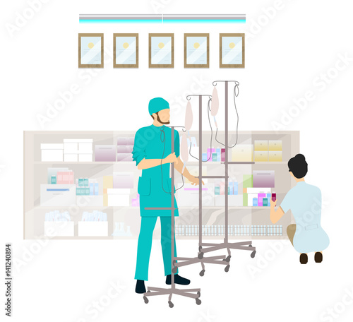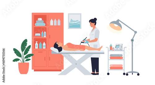 Massage therapist, male cartoon character, masseur giving back pain treatment massage to man lying on table, flat vector illustration. Relaxing, professional therapeutic massage. Spa salon, clinic.