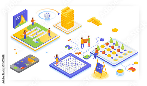 Math education game for kids, landing page design, website banner template, flat vector isometric illustration. Children learning mathematics. Fun math worksheets, quizzes, number puzzles.