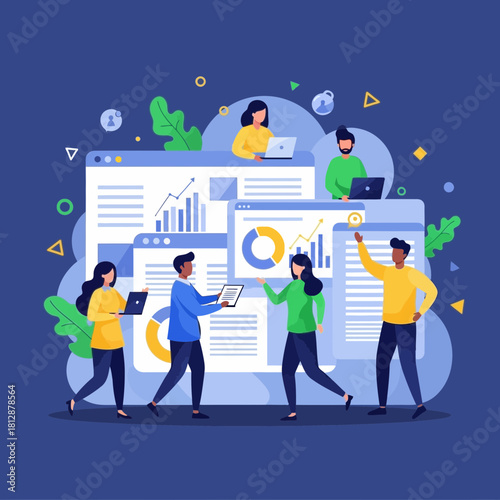 Maths concept vector flat illustration. Mathematical formulas on big computer monitor, tiny students studying math, university professor writing formulas equation drawing function graph on chalkboard.