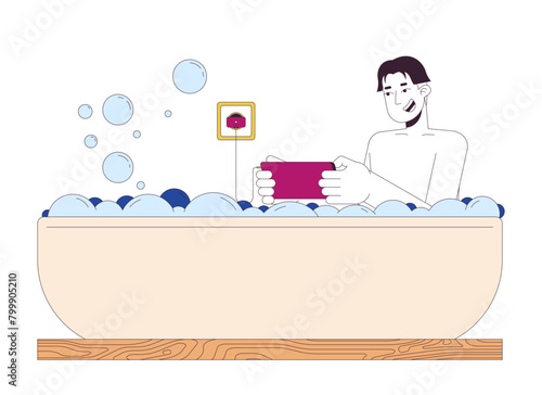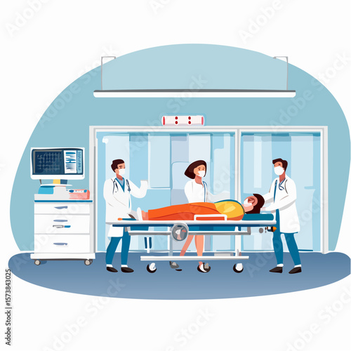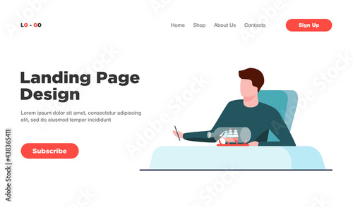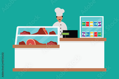 Meat store, flat vector illustration. Salesman standing at display fridge counter with fresh pork, beef, sausage. Farm food market. Butchers shop. Supermarket, grocery store meat section, department.