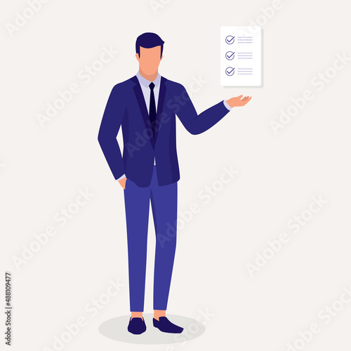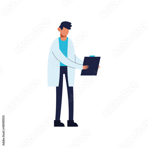 Vector illustration of smiling doctor male in white coat with stethoscope holding clipboard or medical report. Medical doctor therapist flat style design element, icon isolated on white background.