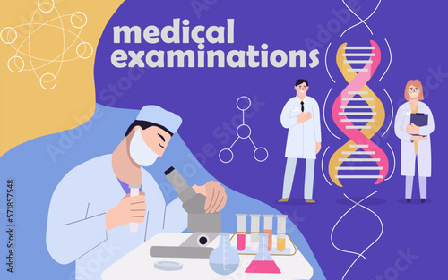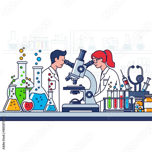 Lab professionals studying corona virus, vector flat illustration. Medical scientists inspecting human lungs infected by respiratory corona virus, developing vaccine, working with patient specimens.