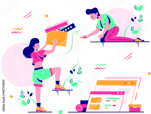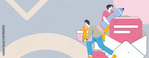 Huge pill bottle and micro characters with pharmaceutical drug capsule, spray bottle, vector illustration. Pharmacy, medication, medicine and healthcare concept for web banner, website page etc.