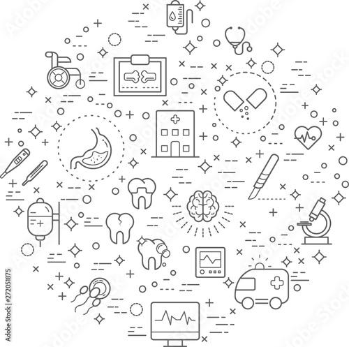 Medicine concept vector illustration. Modern line art flat style design element in the shape of tooth with medical icons, symbols for web banner and printed materials.