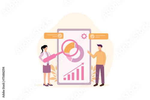 Vector illustration of big computer monitor and people cartoon characters with syringer, magnifying glass, laptop. Telemedicine, online medical consultation concept for web banner, website page etc.