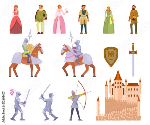 Medieval knight icon set. Vector illustration of medieval cartoon characters king, queen, peasants, knights with spears, archer, castle, sword, shield isolated on white background. Flat style design.