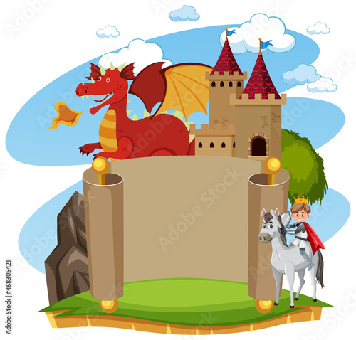 Medieval scene with armored knights on horseback with lances coming near to castle standing on hill. Vector flat style design illustration.