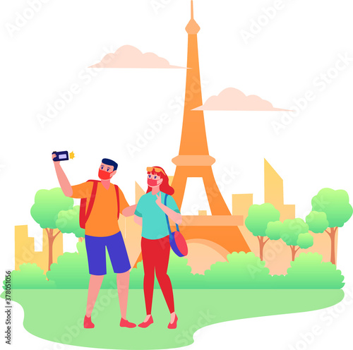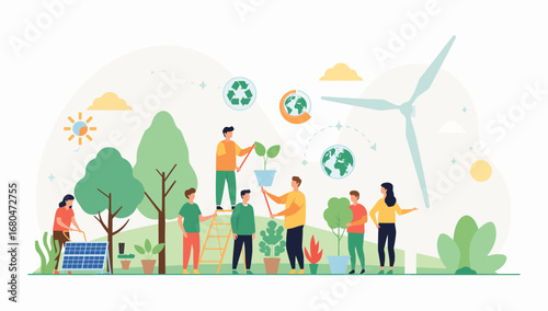 Vector illustration of medieval scene with knight on horseback with full knights equipment including helmet, mail-shirt, lance and shield, peasants, windmill, countryside landscape. Flat style design.
