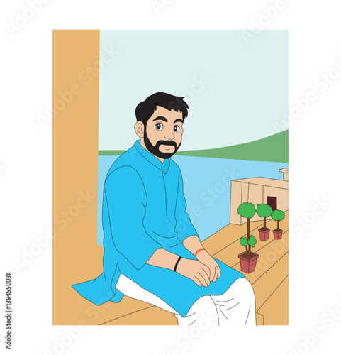 Medieval tavern with waitress and customer vector icon isolated on white background.