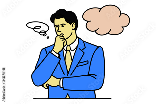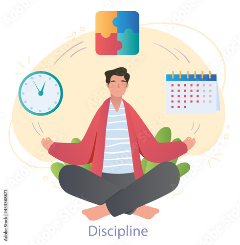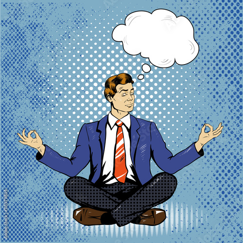 Meditating businessman with speech bubble in retro pop art comic style. Mental balance and yoga concept. Money flying around businessman.