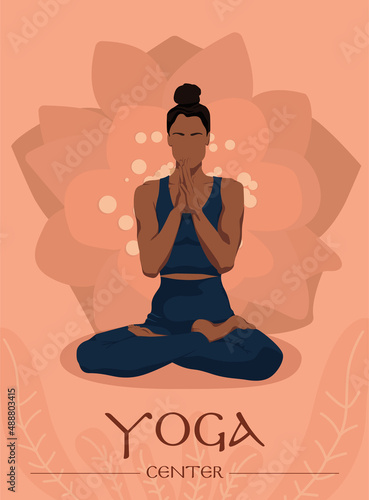 Meditating woman with speech bubble in retro pop art comic style. Mental balance and yoga concept.