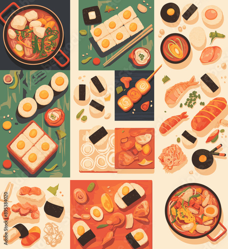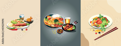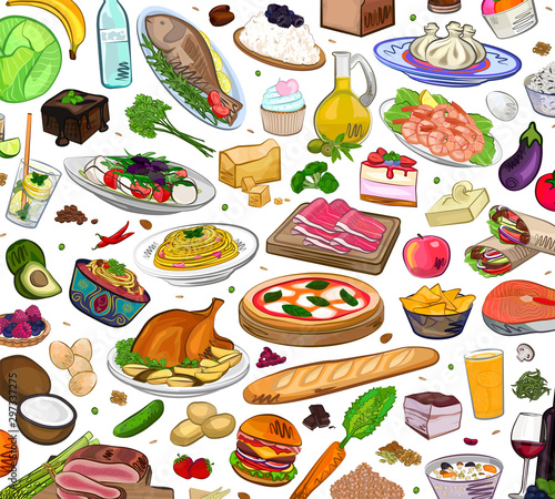 Mediterranean food with fish, salad and vegetables. Woman cooking healthy meal with fresh ingredients. Vector set of hand drawn illustrations and posters.