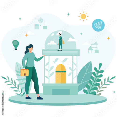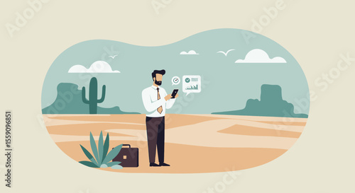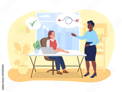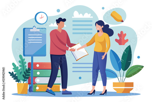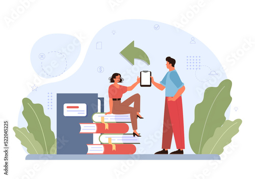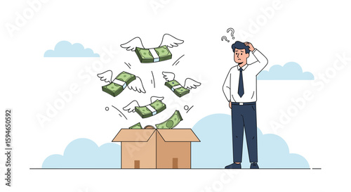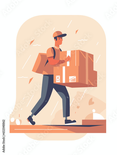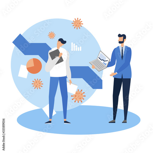 Young man shopping for shoes in menswear fashion boutique, vector flat illustration. Men clothing store interior with trousers, t-shirt, caps, sport shoes on sale, seller and buyer cartoon characters.