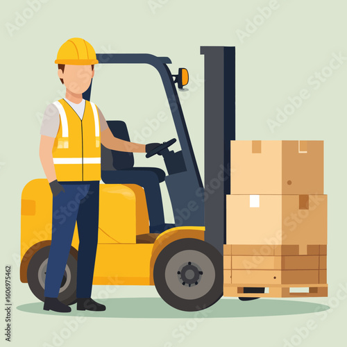 Merchandise warehouse scene set, flat vector isolated illustration. Warehouse workers, loaders, forklift, loading cart, cardboard boxes. Storage services.