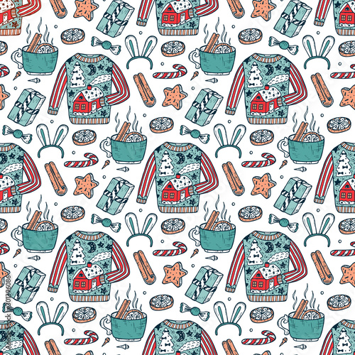 Merry christmas and happy new year greeting card and background template. Winter holiday vector illustration in vintage style. Christmas tree and toys, santa claus. 2021 new year hand drawn poster.