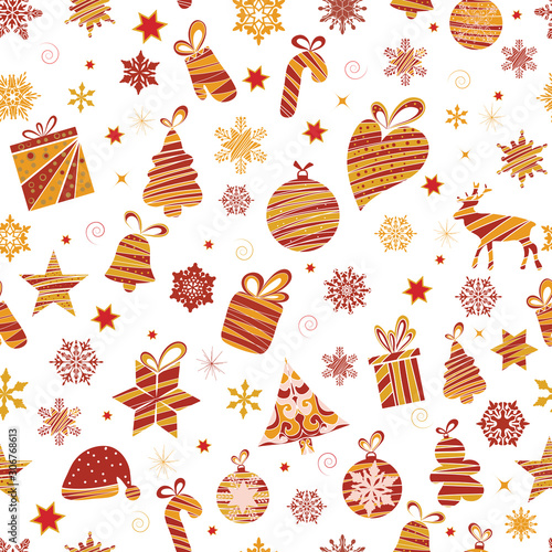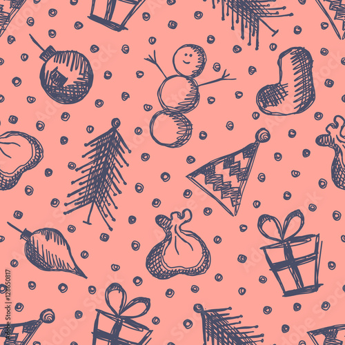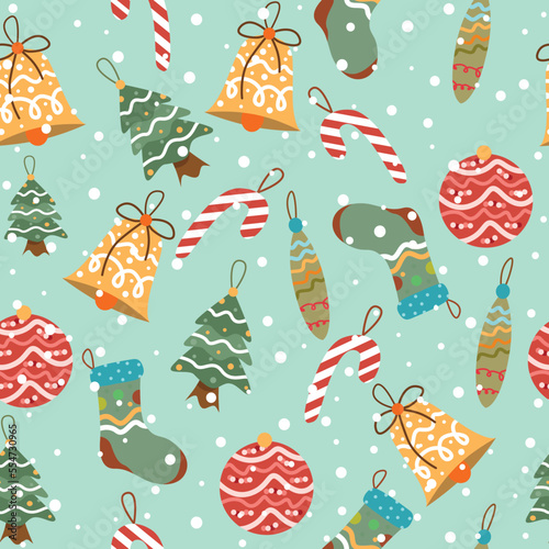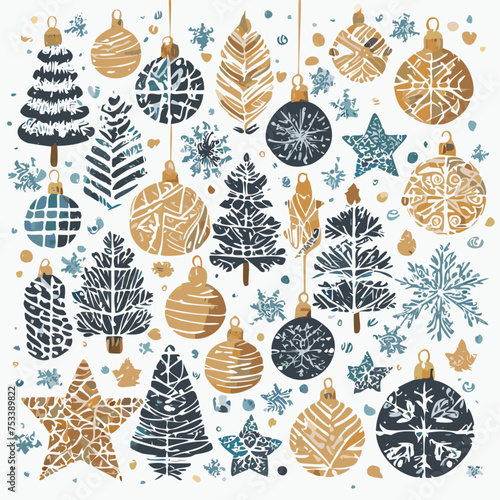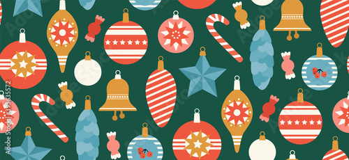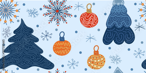 Merry christmas and happy new year greeting card and background template. Winter holiday vector illustration in vintage style. Christmas tree and toys. 2021 new year hand drawn poster.
