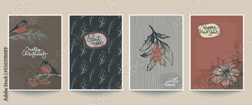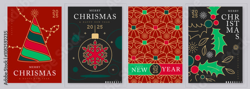 Merry christmas and happy new year greeting cards template. Vector set of winter holiday illustrations in vintage style. Christmas tree and toys. 2022 new year hand drawn posters.