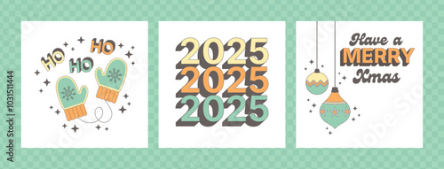 Merry christmas and happy new year greeting cards template. Vector set of winter holiday illustrations in vintage style. Christmas tree and toys. 2023 new year hand drawn poster.