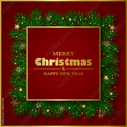 Merry Christmas and Happy New Year greeting card vector template. Paper cut Christmas tree branches frame with balls, stocking, gift boxes.